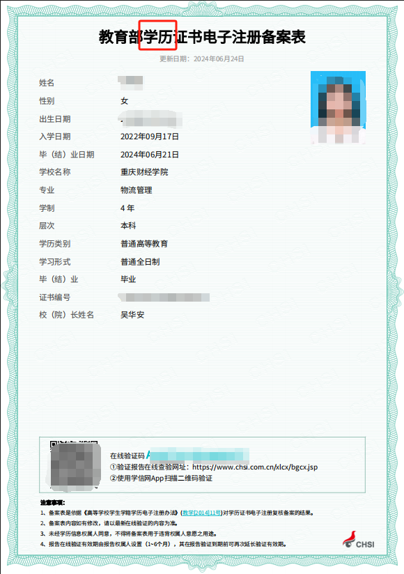 学历、学位电子注册备案表(或验证报告)如图所示: