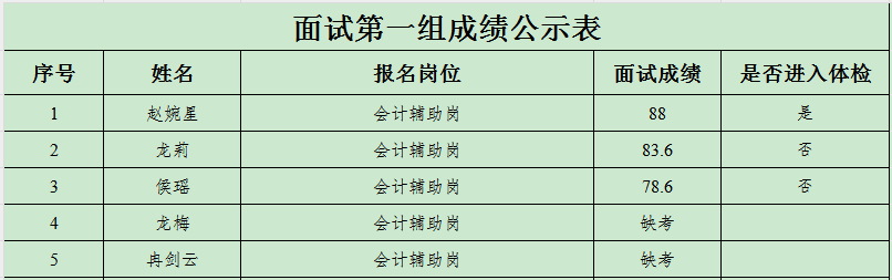 根据招聘启事,经过面试,现将面试成绩及进入体检环节人员进行公布,名单如下: